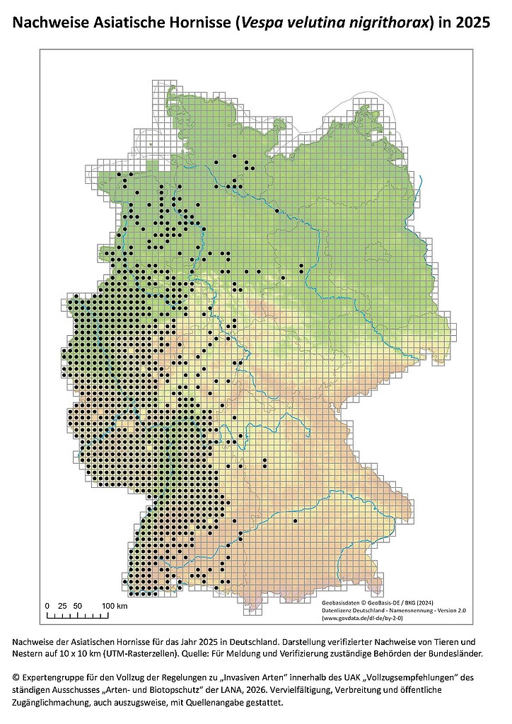 Die Karte enthält alle amtlichen Meldungen von Asiatischen Hornissen und Hornissennestern, die im Jahr 2025 über die offiziellen Meldeplattformen der Bundesländer eingegangen sind.